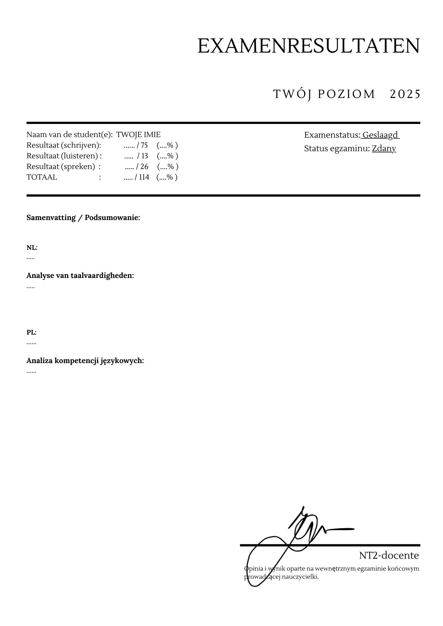 Po zakończeniu semestru otrzymasz certyfikat wewnętrzny, który potwierdza Twój poziom językowy i postępy. To świetny sposób, aby zmierzyć swoje umiejętności i śledzić rozwój nauki.